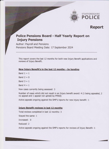 Please find the attached copy of the half yearly report on Injury on Duty Reviews presented to the Pensions Board on 17th September 2024.