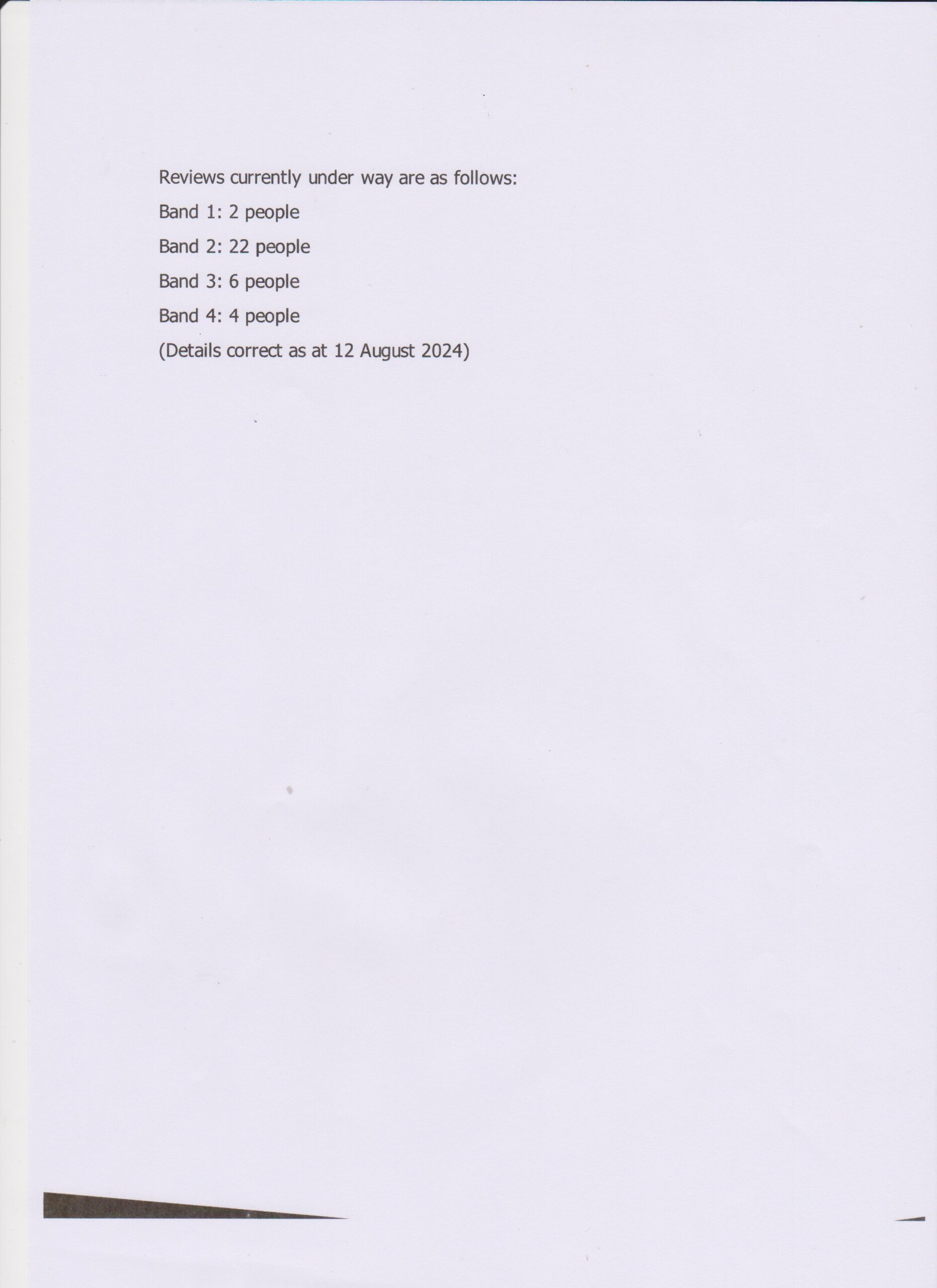 2. Of those to be reviewed, 17 are on Band 4, 55 are on Band 3, 107 are on Band 2, 83 are on Band 1 and there are 2 whose current Banding is as yet unknown.