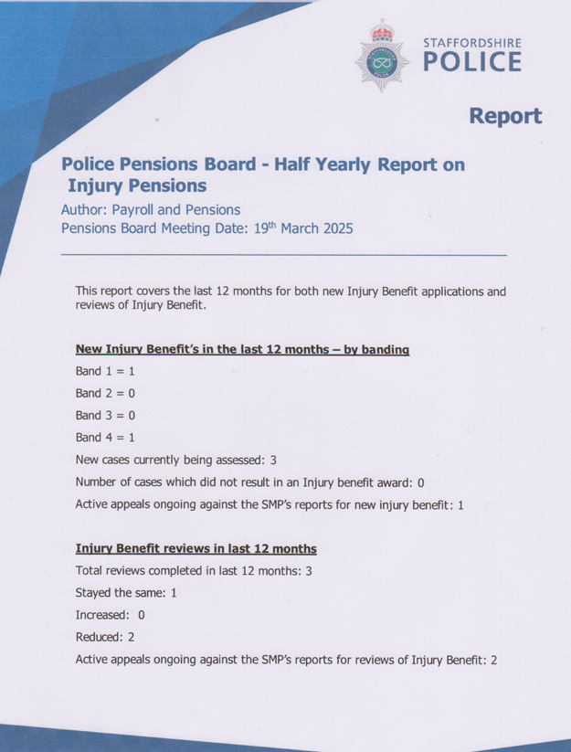 Please find the attached copy of the half yearly report on Injury on Duty Reviews presented to the Pensions Board on 19th March 2025.