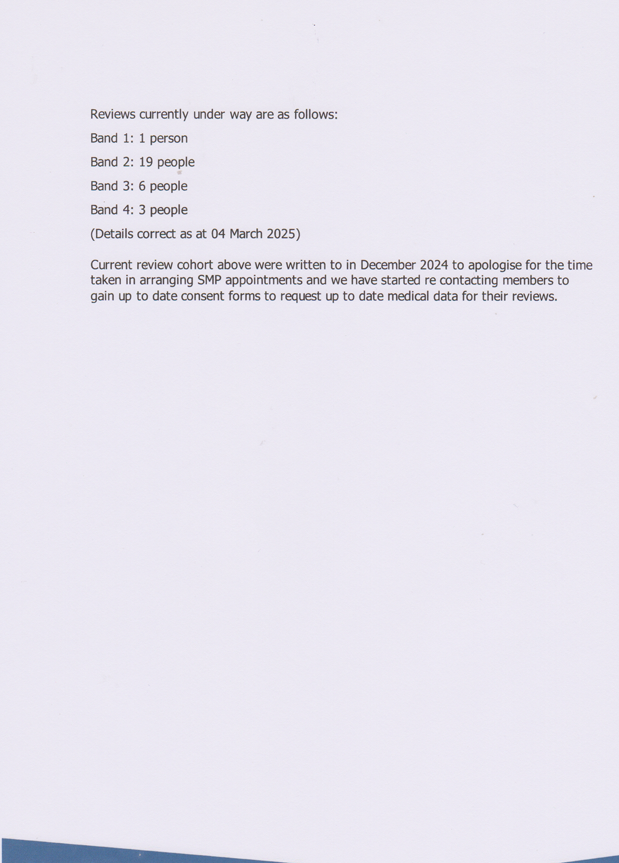 3. Please note, we are reviewing everyone on Band 1. If they declare that they think there is a substantial change in their disablement, their case is forwarded to the SMP for an appointment. Of 4people on Band 1 so far contacted, one is being put forward for examination by the SMP.